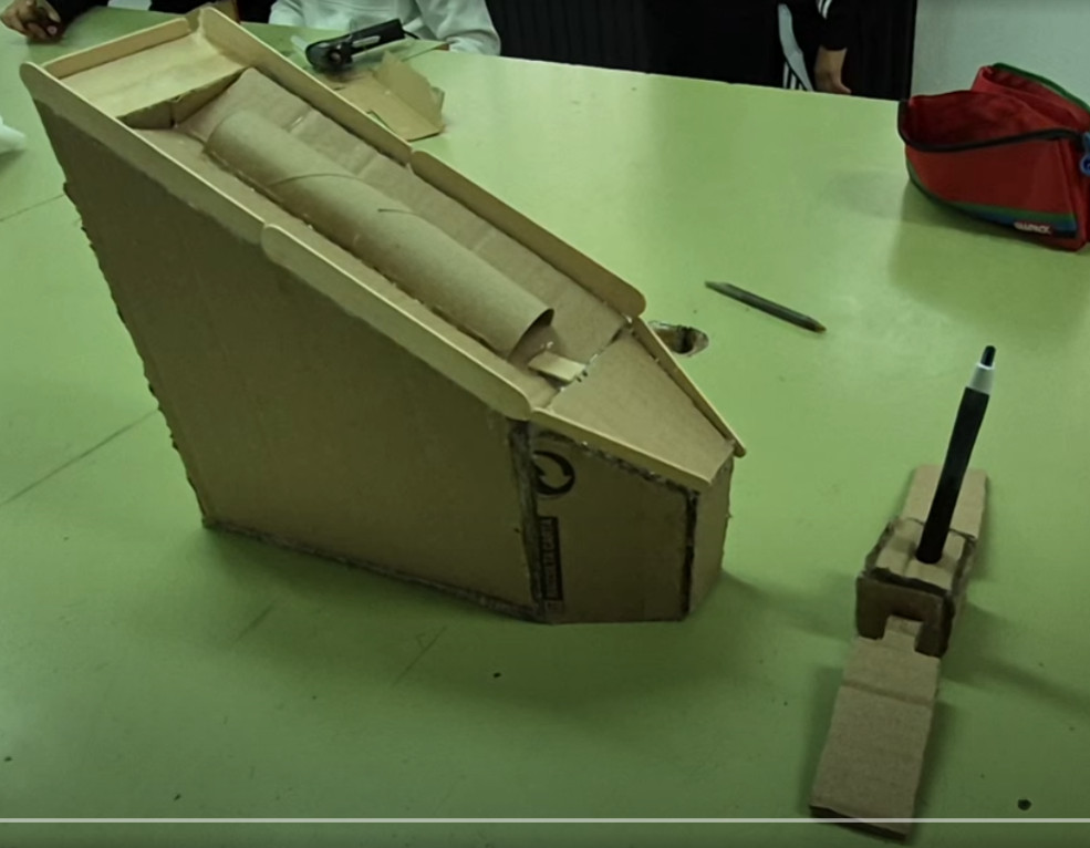 El reto consiste en diseñar un satélite en forma de cubo que pueda sostener una antena (un bolígrafo) y después crear una rampa para intentar derribar esa antena con una canica, igual que si simuláramos una prueba o impacto en el espacio.
